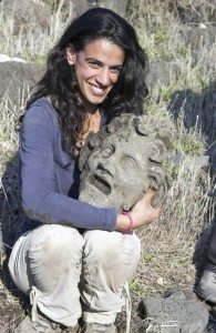 Fotografía facilitada por la Universidad de Haifa que muestra a una arqueóloga con una máscara de bronce del dios Pan.