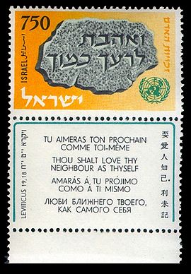 Estampilla israelí con fragmento de hallazgo arqueológico exhibiendo la inscripción hebrea «Amarás a tu prójimo como a ti mismo» (Levítico 19:18).