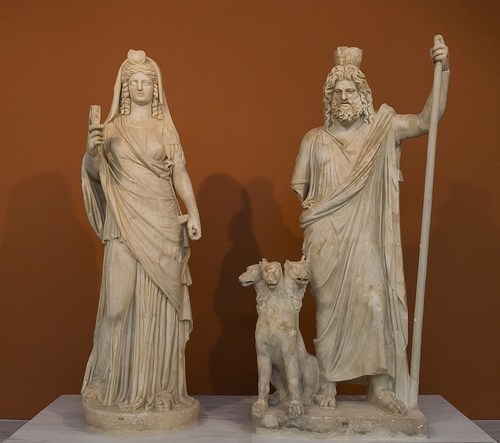 Un ejemplo de esto en el arte es la cerámica de figuras negras que representan a Hércules y Cerbero en una hidria que data de 530-520 a.C. (vasija que actualmente se encuentra albergada en el Museo del Louvre en París). En Grecia, igual que en la antigua Sumeria, el perro es asociado con la diosas y ambas diosas, Artemisa y Hécate poseían perros (Artemisa tenía perros de caza, mientras que Hécate tenía perros molosos de color negro).