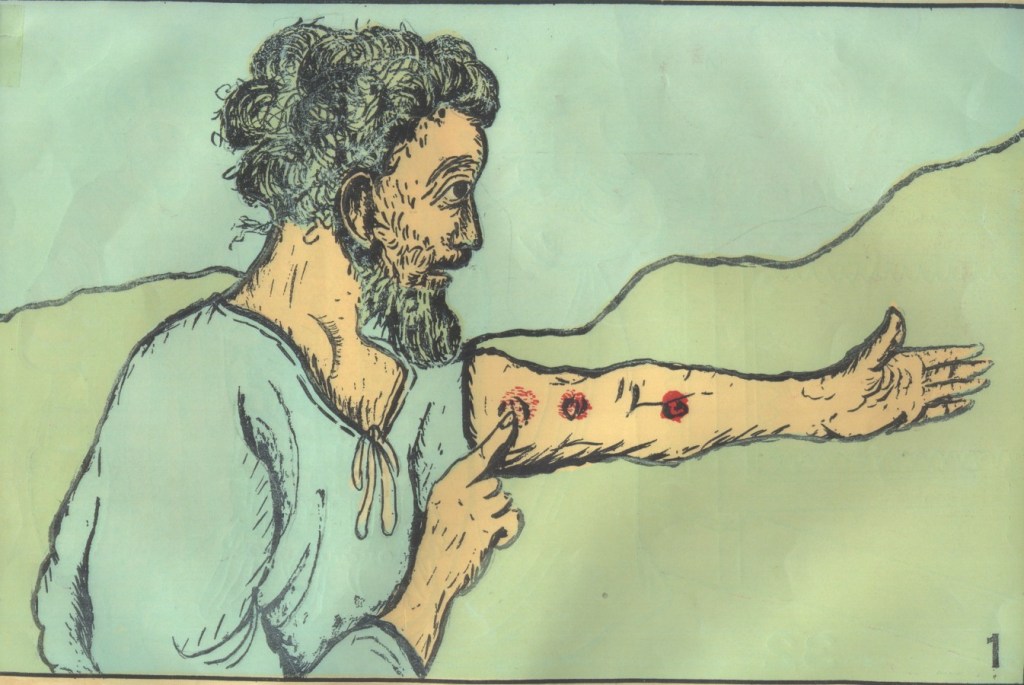 Tal vez esta última idea esté representada por la sangre de uno de los pájaros que el cohén había inmolado y con el cual rociaba al pájaro vivo.