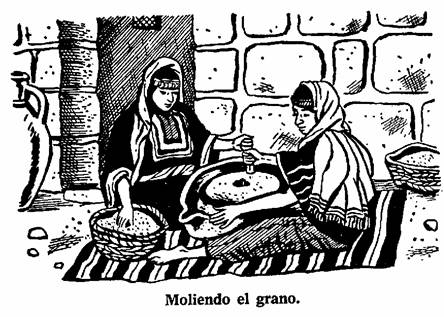 «La piedra superior da vueltas en derredor de un pivote de madera en el Centro de la de abajo. El agujero de la piedra superior para el pivote esta· en forma de embudo para recibir el maíz, el que es puesto por ambas mujeres dentro, según se requiere. La harina que va saliendo de entre las piedras se recoge en una piel de oveja puesta bajo el molino«.