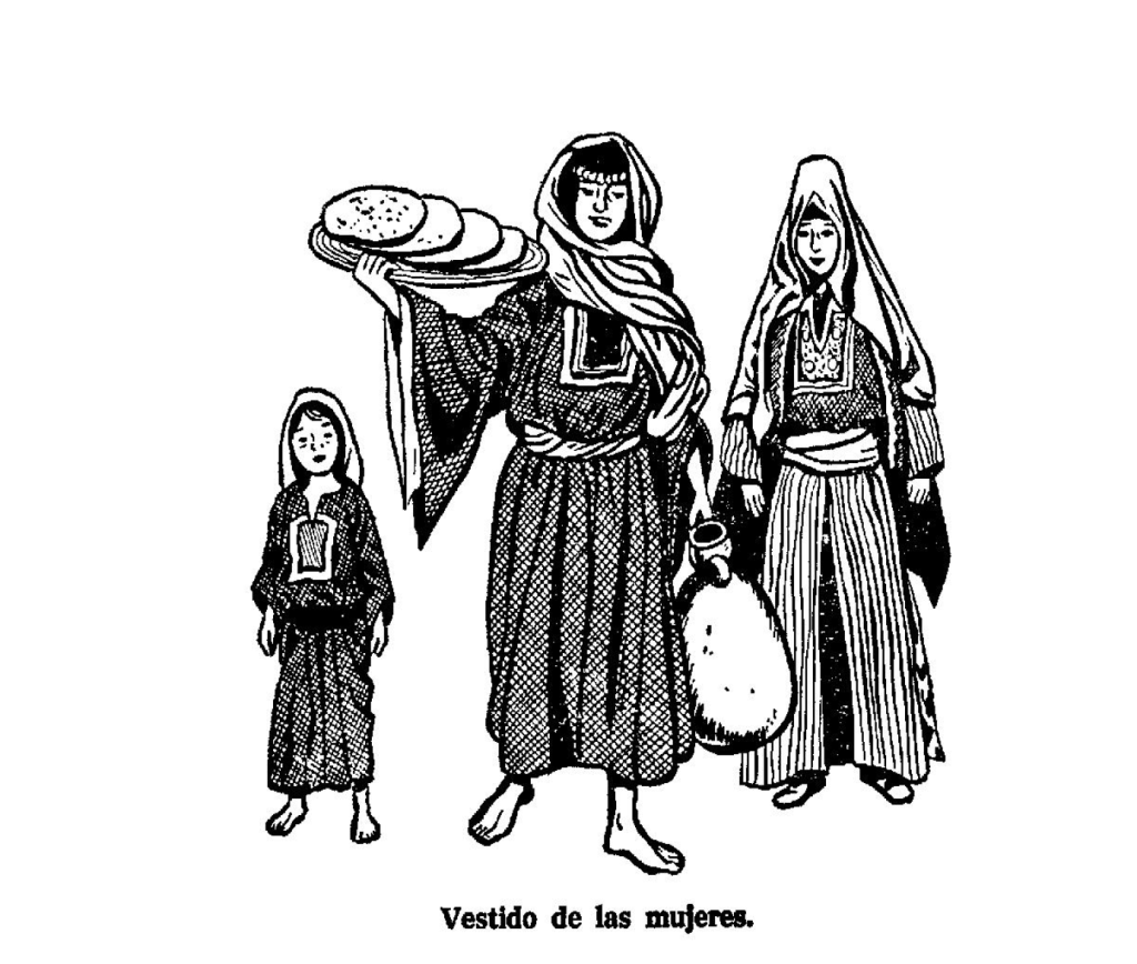 El vestido exterior que los aldeanos palestinos usan, es una larga que serviría a los occidentales de abrigo. Se fabrica de o pelo de cabra y algunas veces de algodón. Es de color café oscuro de diferentes tonos y con tiras blancuscas perpendiculares, como abrigo contra el viento y la lluvia, y como cobertor por las noches. Es un cuadro más o menos común el ver a un hombre andando en un día caluroso, llevando su pesada capa. Y si se le pregunta por qué la lleva, su contestación será, «Lo que resguarda del frío, resguarda también del calor«.