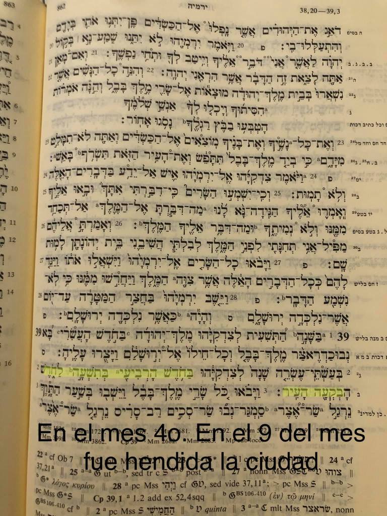 - Un 9 de Tamuz, los ejércitos de Babilonia, del rey Nabucodonosor, hicieron una brecha o grieta en las murallas de Jerusalén en el año hebreo 3338 (423 aC). Y el rey Sedequías de Judá, fue capturado y llevado a Babilonia. Tres semanas más tarde (el 9 de Av), se terminó la total captura de Jerusalén, con la destrucción del Templo y el exilio de la mayoría de los judíos a Babilonia.