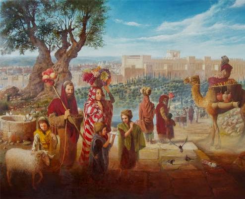El fastuoso evento de la entrega de las primicias ante el Santuario, constituía uno de los acontecimientos más hermosos y vibrantes del año. Millares de familias llegaban desde la periferia de Jerusalén al Templo sagrado, con sus ofrendas preciosamente engalanadas, colocadas en carruajes finamente decorados; mientras eran flanqueados por la multitud citadina que vitoreaba con saludos y vítores a los campesinos visitantes.