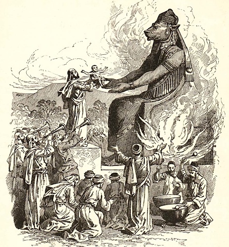Moloc era un antiguo ídolo cananeo, llamado por los fenicios y cartagineses Melkarth, Baal-melech, Malcom, y otros nombres por el estilo, y se relaciona con Baal, un dios sol al que se adoraba, como a Cronos y Saturno, por medio del sacrificio de niños. Era representado por una estatua de bronce, la cual estaba hueca y era capaz de ser calentada, tenía la forma de una cabeza de toro, y los brazos extendidos para recibir a los niños que eran sacrificados. Desde el tiempo de Acaz los niños eran sacrificados en Jerusalén en el valle de Ben-Hinnom, y después eran sacrificados al ser quemados en los calentados brazos de Baal (Ezeq. 16:20, 21; 20:31; Jer. 32:35; 2 de Reyes 23:10; 16:3; 17:17; 21:6, cf. Sal. 106:37, 38).