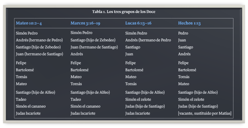 Los autores de los Evangelios no aportan muchos detalles sobre los Doce, ni tampoco Lucas en el libro de Hechos ofrece información sobre el trasfondo o la labor de los Doce, a los que enumera en Hechos 1:8 (obsérvese en Hch 1:26 la adición de Matías, que sustituye a Judas Iscariote). Debido al enfoque biográfico de Lucas sobre Pedro en la primera mitad de Hechos, disponemos de información sobre Pedro para los primeros doce años de su ministerio (antes de abandonar Jerusalén en el año 41/42 A. D.) y alguna información sobre Juan. Los Hechos apócrifos de diversos apóstoles aportan poco en forma de información históricamente fiable sobre los miembros del círculo de los Doce. El tratamiento de los Doce que se hace aquí sigue la secuencia de los nombres en Mateo 10:2–4.