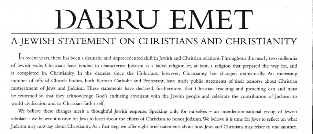 La publicación de Dabru Emet: Una declaración judía sobre los cristianos y el cristianismo, en septiembre de 2000, demostró el compromiso de un gran número de eruditos y rabinos de los movimientos reconstruccionista, reformista, conservador y ortodoxo moderno de entablar una nueva relación con los cristianos. Esta obertura se atrevió a situar la teología en el centro de la conversación, como consecuencia de lo cual un número creciente de académicos y clérigos judíos están empezando a darse cuenta de que un encuentro con las afirmaciones de verdad, prácticas y creencias más fundacionales de sus vecinos cristianos puede funcionar como catalizador para una mayor comprensión de su propia tradición, así como de la del otro.