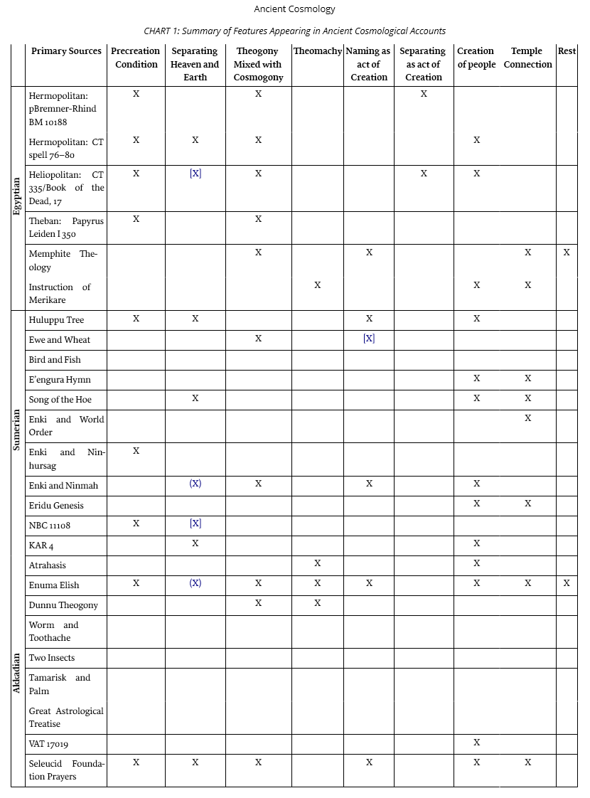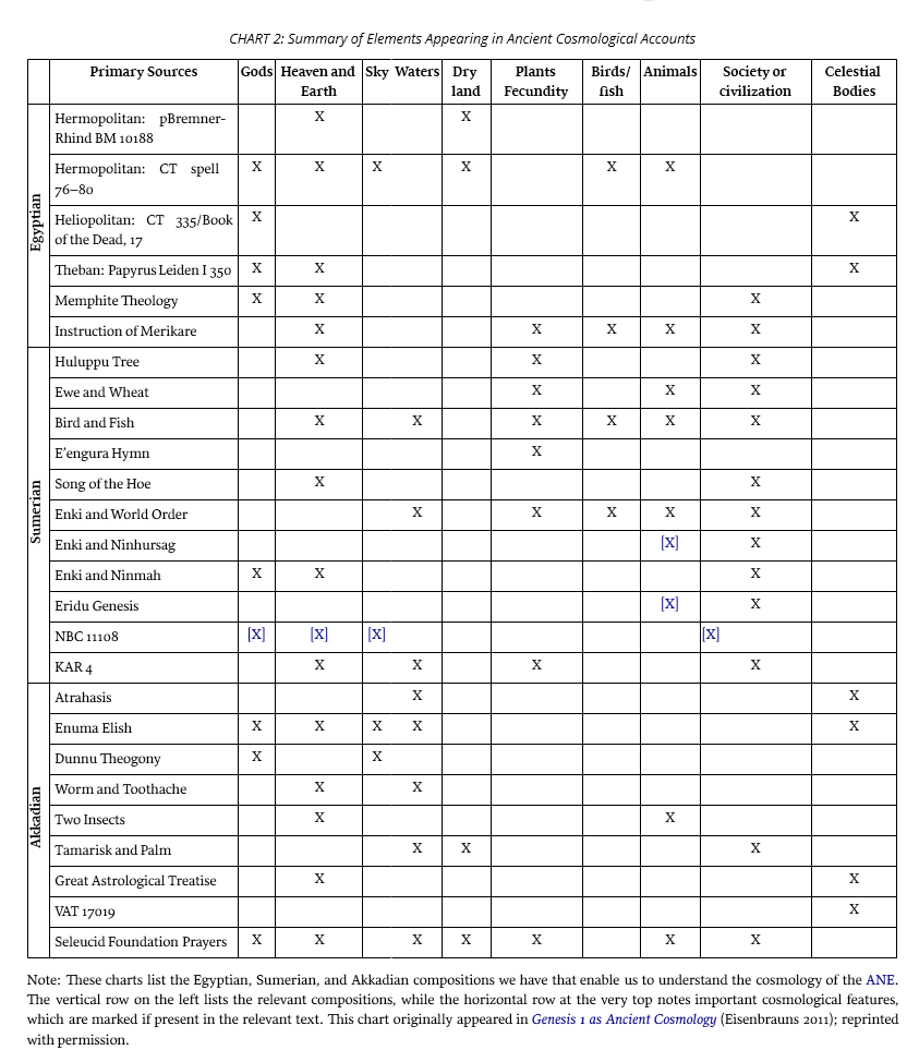 Nota: Estos gráficos enumeran las composiciones egipcias, sumerias y acadias de las que disponemos que nos permiten comprender la cosmología del ANE. La fila vertical de la izquierda enumera las composiciones pertinentes, mientras que la fila horizontal de la parte superior señala las características cosmológicas importantes, que se marcan si están presentes en el texto correspondiente. Este gráfico apareció originalmente en Génesis 1 como Cosmología antigua (Eisenbrauns 2011).