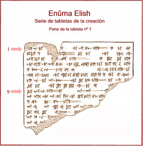 Hoy en día se suele fechar Enuma Elish entre los siglos XIV y XV a.C. Se convirtió en texto muy copiado, que era recitado el cuarto día del festival del Año Nuevo en Babilonia. Al principio de la historia no existe nada más que las aguas primordiales, Apsu y Tiamat, que dan a luz a los dioses antiguos. Sin embargo, la actividad de los dioses molesta a Apsu, que planea destruirlos. Cuando se entera de eso, Ea hace que Apsu caiga en un profundo sueño mediante un conjuro y lo mata. Luego construye un palacio sobre el cadáver de Apsu, en el que él y Damkina dan a luz a Marduk. Marduk resulta ser más grande que cualquiera de sus predecesores, pero su juego molesta a Tiamat. Como consecuencia de ello, algunos dioses, aparentemente llevados por sus celos hacia Marduk, se unen a ella en un plan para destruir a los demás dioses. Cuando se enteran de ello, los otros dioses se llenan de temor y no saben qué hacer, hasta que aparece Marduk y se ofrece a pelear en su nombre—siempre que acuerden darle el poder de determinar el destino y le hagan rey.