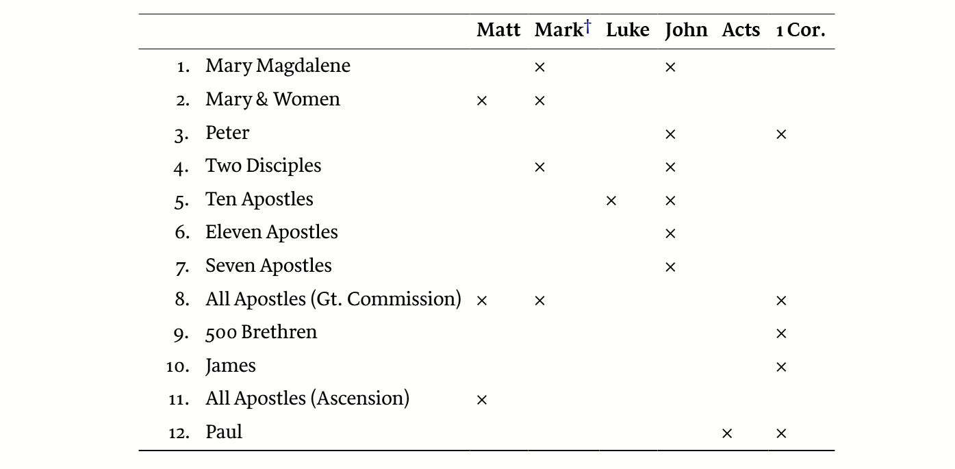 El Nuevo Testamento supera los criterios de credibilidad. Hay muchas razones para aceptar la autenticidad de los relatos del Nuevo Testamento, con todo su supuesto desorden (Vease Criterios de historicidad en los evangelios). Seis relatos de las apariciones posteriores a la resurrección, Mateo 28; Marcos 16; Lucas 24; Juan 20-21; Hechos, 9; y 1 Corintios 15, abarcan un período de cuarenta días en el que Jesús fue visto vivo por más de 500 personas en once ocasiones. Dado que algunos de estos testigos vieron la tumba vacía y las ropas del sepulcro, tocaron las cicatrices de Jesús y le vieron comer, no hay duda razonable sobre la realidad de su resurrección.