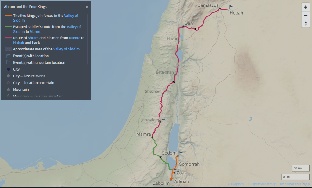 La narración de la guerra entre la coalición mesopotámica de cuatro reyes contra los cinco reyes locales está repleta de referencias geográficas; por desgracia, muchas de ellas no son identificables. Al comienzo del altercado, los reyes de Sodoma, Gomorra, Adma, Zeboim y Bela (es decir, Zoar), se unieron y se rebelaron contra las más poderosas fuerzas mesopotámicas a las que habían estado sometidos durante doce años. Se reunieron en el Valle de Siddim, que el texto identifica con el Mar de la Sal (Gn 14:3).