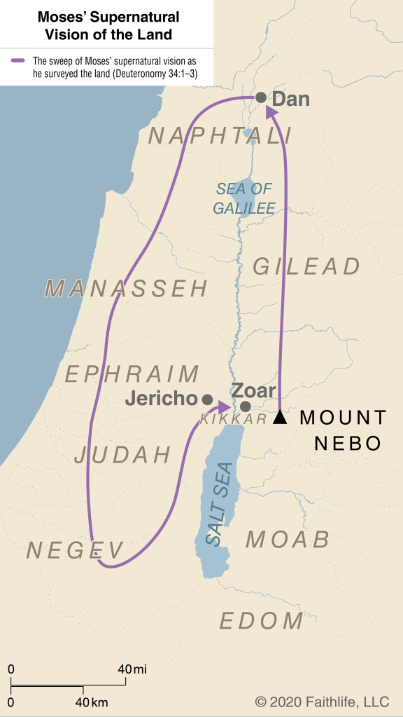 En cambio, la visión sobrenatural que Moisés tuvo de la tierra desde las alturas del monte Nebo sí aporta información útil. Desde esa posición ventajosa, miró hacia el norte a través de Galaad hasta Dan, luego en dirección oeste a través de lo que sería la zona tribal de Neftalí al noroeste del mar de Galilea, a través de la tierra de las dos principales tribus de José (Efraín y Manasés), continuando a través de la tierra que sería Judá y hasta el mar Mediterráneo. La visión continuaba con «el Neguev y el kikkar, el valle de Jericó, la ciudad de las palmeras, hasta Zoar» (Dt 34:3).