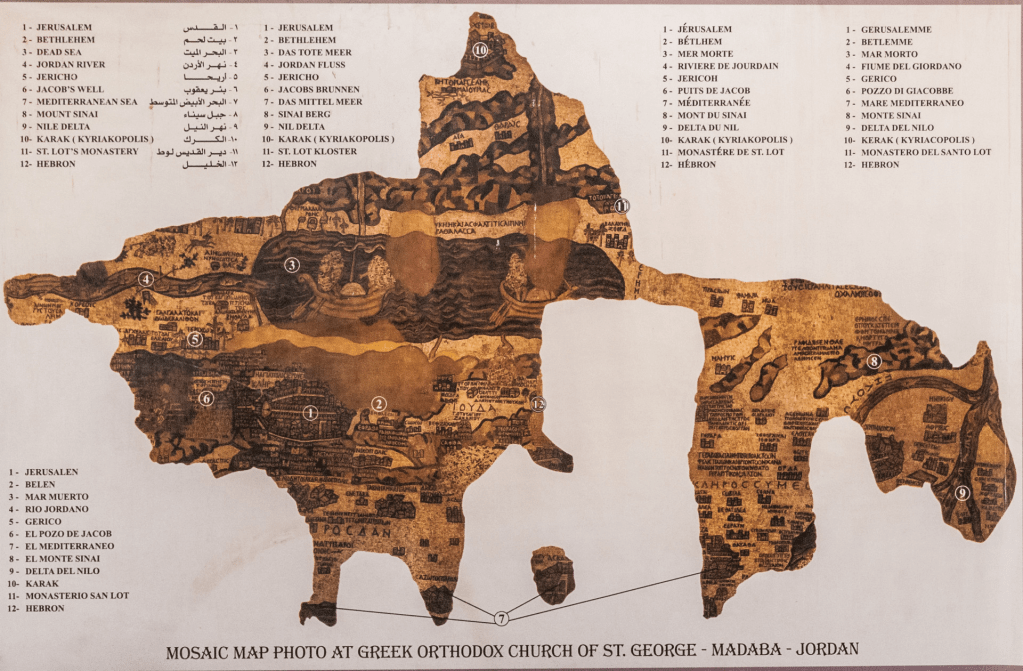 - Saller y Bagatti, Town of Nebo, 194-95; O’Callaghan, «Madaba (Carte de)»; Avi-Yonah, Madaba Mosaic Map; Avi-Yonah, «Medeba (Madaba)»; Gold, «Mosaic Map»; Donner y Cuppers, Die Mosaikkarte von Madeba. ↩︎