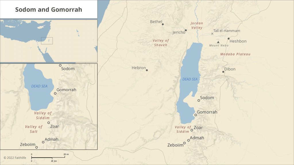 La ciudad de Sodoma ocupa un lugar central en los relatos sobre la decisión de Lot de establecerse en el valle del Jordán y su posterior desarraigo varias veces de ese lugar. Las otras ciudades de la llanura -Gomorra, Adma, Zeboim y Zoar (también llamada Bela)- no aparecen con tanta frecuencia y parecen ser satélites, que a veces merecen una mención especial y otras no. Gomorra tiene un significado cultural más importante que Adma, Zeboim y Zoar, aunque la última es importante en términos de posible conservación de topónimos.
