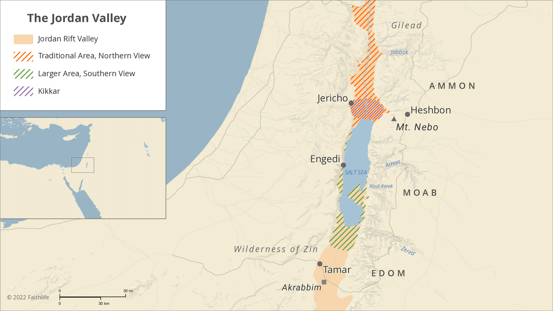 El término descriptivo traducido «llanura» es kikkar (כִּכָּר), que significa algo redondo. Cuando se utiliza en el contexto del valle del Jordán, se refiere mejor a la parte más amplia del valle del Jordán, justo al norte del Mar Salado. Allí, la extensión del ghor -la totalidad del valle de un lado a otro de la grieta- es de aproximadamente doce millas (19 km), frente a la anchura media de seis millas (9,5 km) del resto del valle4.