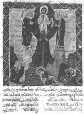 Una iluminación que representa la transfiguración de Cristo, de un MS sirio jacobita (Biblioteca Vaticana, Syr 559)Si Marcos 9:1 siguiera inmediatamente después de este contraste en Marcos 8:35, la convicción común de que los espectadores desempeñan un papel protagonista sería más plausible. Sin embargo, esta antigua suposición es difícil de conciliar con la secuencia literaria de Marcos, que pasa de una declaración relativa a los posibles infiltrados (Marcos 8:34) a una declaración de transición que contrasta a los posibles infiltrados con los posibles infiltrados (Marcos 8:35). La secuencia termina con una afirmación más completa relativa a los posibles intrusos (Marcos 8:36-38). La secuencia avanza hacia el juicio aumentando progresivamente la severidad de la advertencia. Toda esta escena funciona apocalípticamente como una garantía de la gloria del Hijo del Hombre, apuntando hacia la resurrección y, por tanto, la seguridad del juicio venidero (Kermode, La génesis del secreto, 69; Hatina, «Quién verá»). La disyunción, por tanto, se identifica mejor como «después de seis días» en Marcos 9:2, lo que concuerda con la tendencia de Marcos a utilizar los cambios de temporalidad para significar nuevos episodios. Así pues, lo más probable es que las predicciones de Marcos 8:34-9:1 no se refieran directamente a la transfiguración. Sin embargo, están claramente relacionadas con la futura glorificación de Jesús, el establecimiento del reino de Dios y los actos de juicio y bendición que lo acompañan.