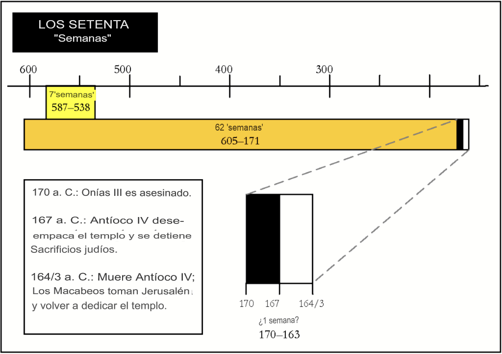 - Si bien esta lectura significa que a estas siete «semanas» iniciales no les suceden cronológicamente las sesenta y dos «semanas», la razón de esta fractura queda meridianamente clara: el autor de Daniel se ve constreñido tanto por el esquema de 70 años de Jeremías como por el curso de la historia real. Aunque el año 587 a.C. es el punto más natural desde el que enumerar la desolación de Jerusalén y sus habitantes, no permite el uso ordenado de un esquema numérico centrado en el número 70. La brecha entre el año 587 a.C. y el 70 a.C. es muy grande. La brecha entre 587 a.C. y el comienzo de la última «semana» en 170 a.C. es de sólo 417 años, y esto no se divide claramente en un período de «semanas».28 Por lo tanto, el autor ha tenido que escalonar los períodos de tiempo para lograr el ajuste deseado con el número 70. Al hacerlo, el autor también ha tenido que escalonar los períodos de tiempo para lograr el ajuste deseado con el número 70. El autor ha tenido que escalonar los períodos de tiempo para lograr el ajuste deseado con el número 70. Al hacerlo, el autor también ha tenido que remontarse hasta el año 605 a.C. para completar las setenta «semanas». Sin embargo, mediante esta técnica, el autor ha conseguido comprimir las setenta «semanas» en un período de 441 años reales (605-163 a.C.).29