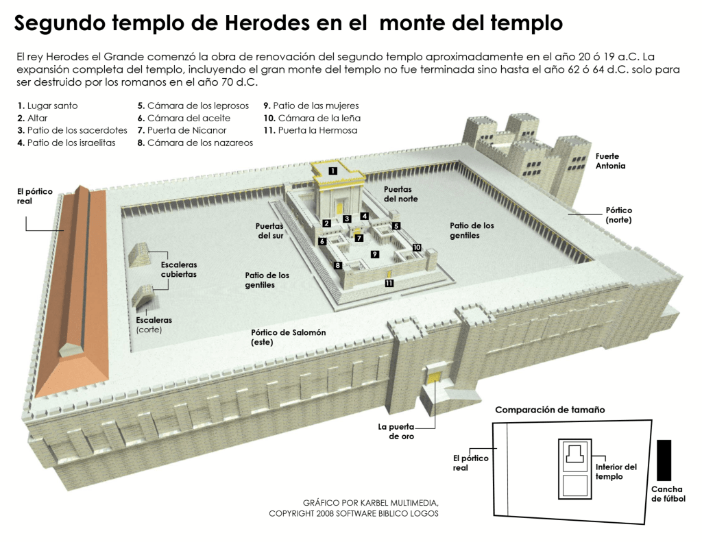 - El modelo del segundo templo de Jerusalén (ubicado en el Museo de Israel), que fue creado por M. Avi-Yonah en la década de 1970, ofrece una vista singular al diseño topográfico y arqueológico de la Jerusalén del primer siglo d.C. que incorpora e ilustra detalles del Nuevo Testamento (principalmente los Evangelios y el libro de Hechos), de Josefo, la Mishná/el Talmud, y de otros antiguos escritos judíos. ↩︎