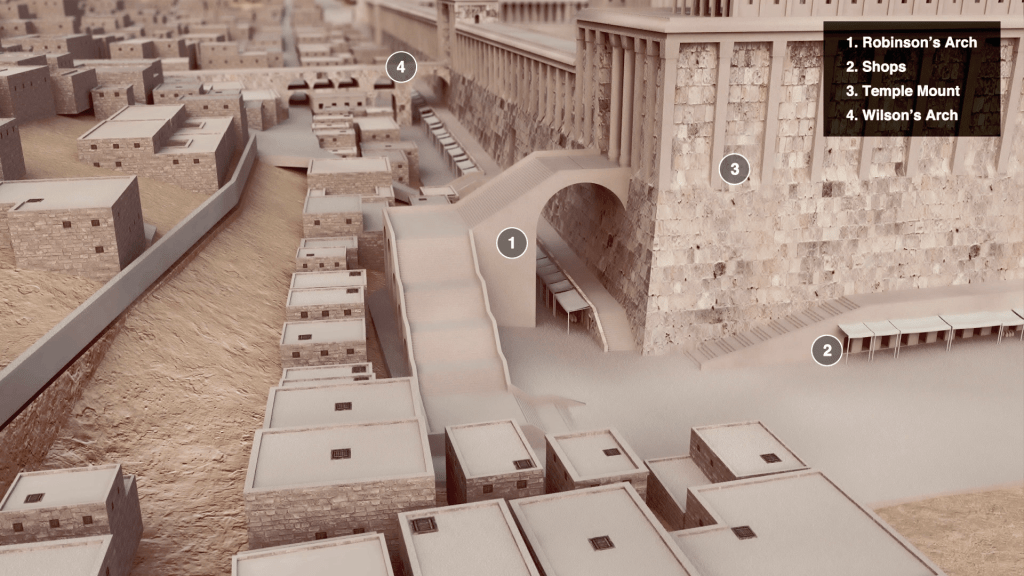 Con relación a este acontecimiento, uno puede imaginarse vívidamente la conmoción que causó Jesús cuando expulsó a los cambistas junto con «bueyes, ovejas y palomas», que deben haber corrido por el Arco de Robinson o las Puerta de Hulda en su trayecto de salida del monte del templo (véase Mateo 21:12–16; Marcos 11:15–19; Lucas 19:45–46; Juan 2:14–15; Salmos 69:9; Isaías 56:7; Jeremías 7:11).