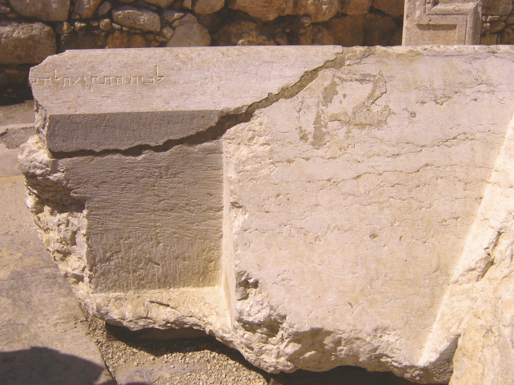 Interesantemente, entre los escombros del colapso del Arco de Robinson y el muro de contención occidental del monte del templo, B. Mazar hallo la piedra angular más alta de la parte superior de la estructura32 con la siguiente inscripción quebrada en hebreo: «el lugar de la trompeta a…».33