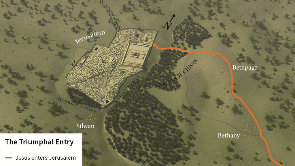 Los cuatro Evangelios incluyen la entrada triunfal de Jesús a Jerusalén al comienzo de la Pascua. Los paralelos entre la entrada triunfal y otros pasajes del Antiguo Testamento40 son numerosos y han sido discutidos en forma extensa por comentaristas.41 Por otro lado, la ruta exacta de la entrada de Jesús al templo no ha sido determinada de forma definitiva.