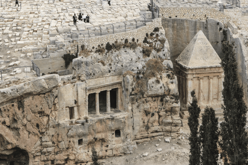 - Sepulcros blanqueados y tumbas de los justos (Mateo 23:27–31)—Varios monumentos fúnebres del período el segundo templo y sepulcros «blanqueados» han sido hallados a lo largo de las pendientes del monte de los Olivos, el valle de Cedrón (p. ej., el Pilar de Absalón/la Tumba de Josafat, la Tumba de Zacarías y la Tumba de Benei Hezir) y el valle de Hinón (p. ej., la «la tumba de Anás»55). Mientras Jesús expresaba sus «ayes» sexta y séptima a los escribas y fariseos (Mateo 23:27–31), resulta claro que usaba estructuras funerarias visible en la geografía circundante de Jerusalén para ilustrar vívidamente la hipocresía del establecimiento religioso judío.