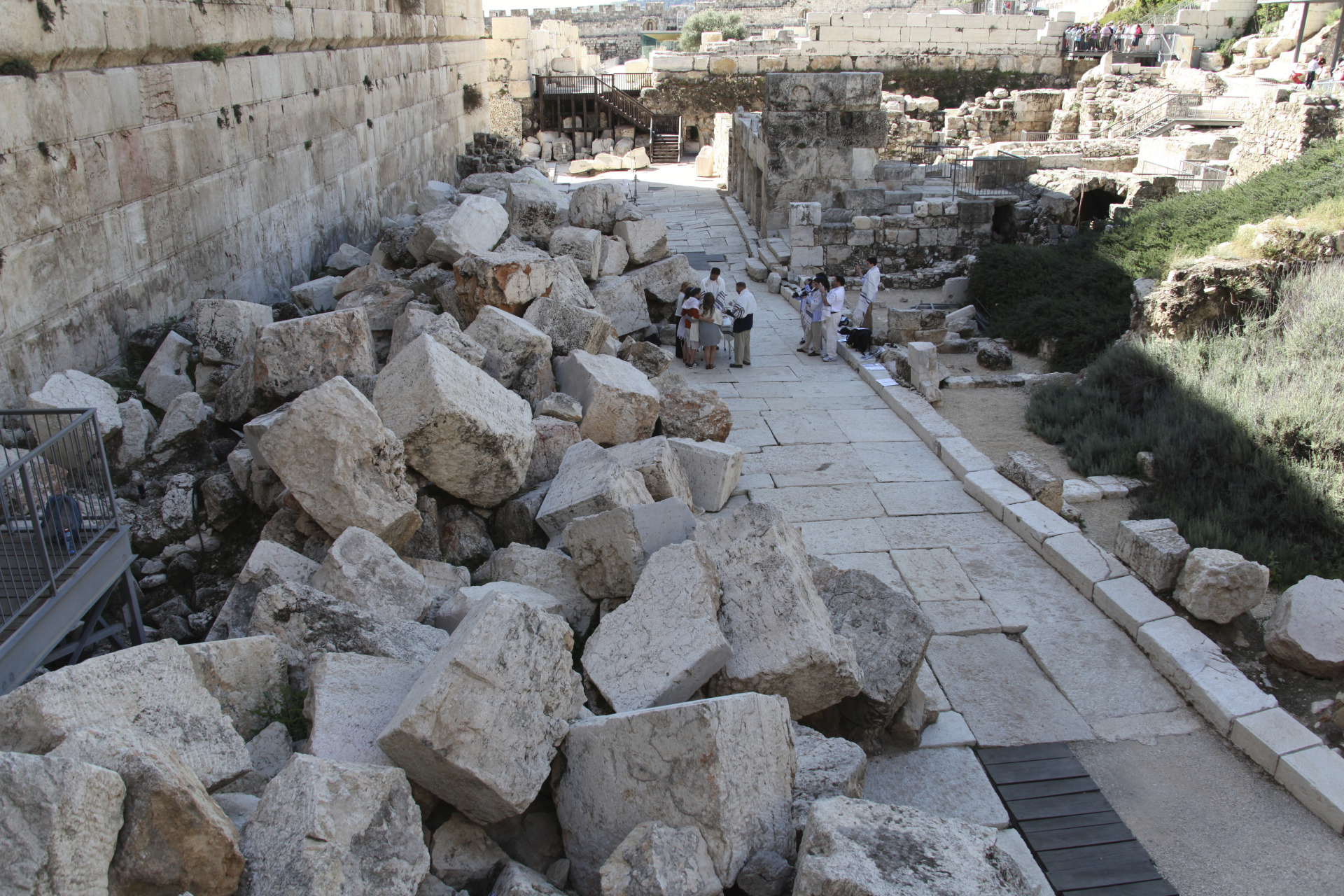 En la zona de las escalinatas meridionales, esta destrucción incluyó todo lo que estaba encima del «curso maestro» de piedras que están localizadas directamente arriba de las escalinatas y la empinada calle alta. Finalmente, en referencia a su entrada como rey algunos días antes, Jesús acusó a los fariseos de apedrear a «los que te son enviados» a Jerusalén, y afirmó que no lo verían de nuevo hasta que dijeran «Bendito el que viene en el nombre del Señor» (Mateo 23:37–39). Es una clara repetición de las citas de Salmos 118:26 en la entrada triunfal y demuestra que la verdadera venida del «día que hizo el Señor» solamente podía ocurrir cuando el rey no muriera, sino que viviera (Salmos 118:17).