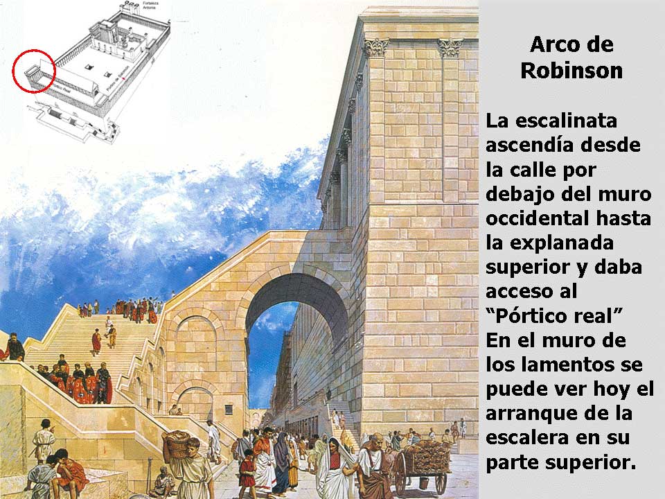 Ahora bien, en la parte occidental de los recintos del templo había cuatro puertas; (1) la primera llevaba al palacio del rey y se dirigía por un pasaje sobre el valle intermedio [Arco de Wilson17]; (2–3) dos más conducían a los suburbios de la ciudad [esto es, las Puerta de Warren y de Barclay18]; (4) y el último llevaba a la otra ciudad, donde el camino descendía hacia el valle por un gran número de gradas, y de allí nuevamente arriba por la subida [esto es, el Arco de Robinson, ver abajo]; porque la ciudad yacía sobre el templo a la manera de un teatro, y estaba cercada por un valle profundo a lo largo del sector sur entero, pero el cuarto frente del templo, que era en dirección sur, tenía en sí puertas en su centro [esto es, las Puertas de Hulda y las Escalinatas Meridionales, ver abajo] (Ant. 15.410–411).19