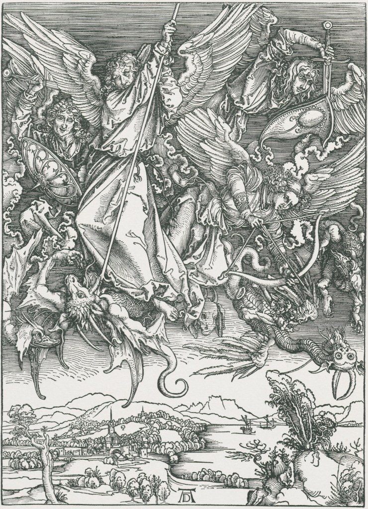 Durante el resto de la historia, el dragón intenta furiosamente devorar a la doncella. (Satanás intenta engañar y destruir a la iglesia). La misión del héroe es matar al dragón y rescatar a la doncella. Y él cumplirá esa misión. (El Cordero consumará su reino para la gloria de Dios matando al dragón y salvando a su novia).