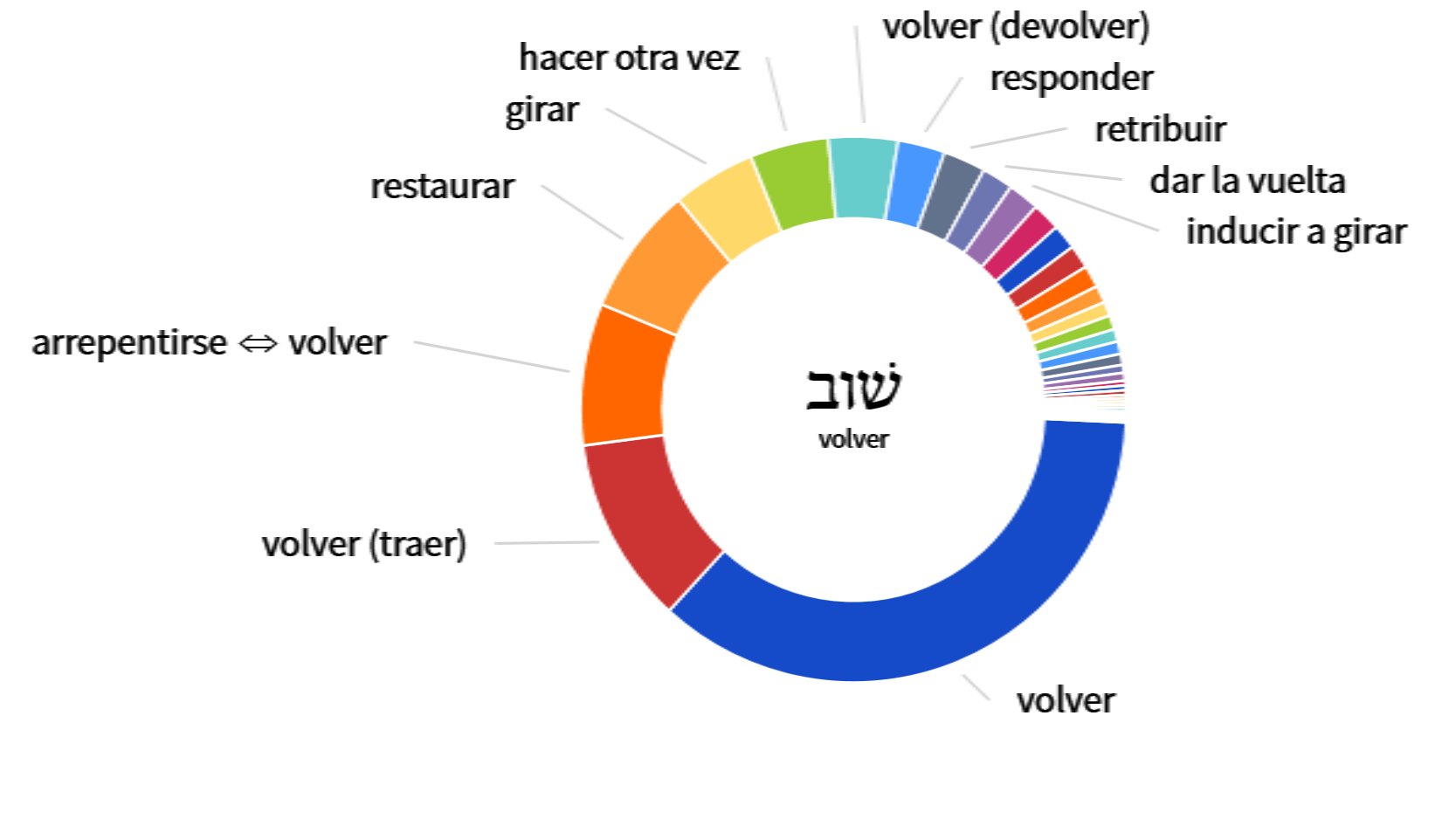 - šûb (שׁוּב) 7725 (8740) 1,075×, v., Q volver, regresar, arrepentirse; HI traer de vuelta, restaurar; HO ser devuelto; POLE volver, restaurar, dar la vuelta.