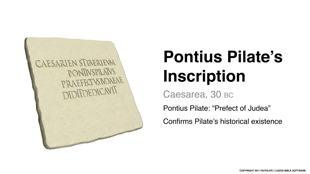Algunos estudiosos sospechaban que Tácito estaba equivocado y que Pilato era un gobernador con rango de prefecto, no de procurador. Una inscripción encontrada en Cesarea Marítima en 1961 confirmó esta sospecha. En una piedra parcialmente borrada que se había utilizado como escalón en el teatro están inscritas las siguientes palabras: